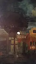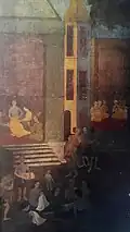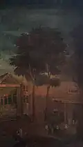 In the meantime, people began exchanging culture and art with European countries. Color materials also began to be imported from abroad. Thus the painting in this period became more vivid and colorful. Khrua In Khong, however, still remained using low saturation, bright objects among dimmed gray and dark background colors. Khrua In Khong was famous for his use of monochromic colors that give harmonious satisfaction, unlike complementary colors. He often used dark shades of blue and green along with light shades of blue, pink and white and avoided contrasting colors. He painted the background with dark colors, male outfits with dark blue and white, while female dresses were light blue or pink making the figures look soft and gentle among a shady background that appears like a dreamy landscape.[3][9][10]
