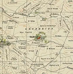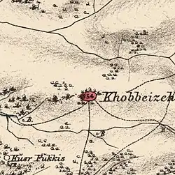 In 1882 the PEF's Survey of Western Palestine described Khobbeizeh as a "village of moderate size on high ground, with wells in the valley to the south".[6]