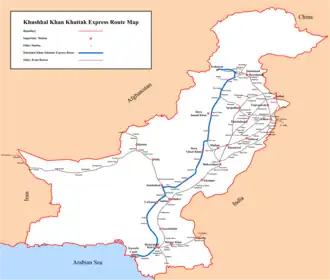 Khushhal Khan Khattak Express (Urdu: خوشحال خان خٹک ایکسپریس) is a passenger train operated daily by Pakistan Railways between Karachi and Peshawar.[1] The trip takes approximately 34 hours and 15 minutes to cover a published distance of 1,512 kilometres (940 mi), traveling along a stretch of the Karachi–Peshawar Railway Line and Kotri–Attock Railway Line.[2][3] The train named after Khushhal Khan Khattak, a Pashtun nationalist and poet, warrior, scholar, and chief of the Khattak tribe.[4] Khushhal Khan Khattak Express was suspended in March 2020 due to Covid-19. After several delays, this train was restored on 24 April 2025. Khushal Khan Khattak Express is a unique train as it is the only train that connects Rajanpur, Dera Ghazi Khan and Kashmor to Karachi. It is also, the only passenger train in Pakistan with three Loco reversals along its route at Attock City Junction, Kot Addu Junction and Jacobabad Junction