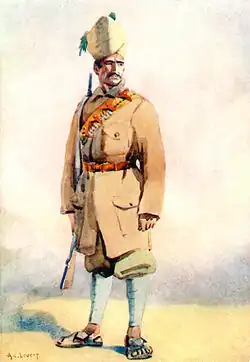 During the period of British rule, the Khyber Rifles was one of eight "Frontier Corps" or paramilitary units recruited from the tribesmen of the North West Frontier, serving as auxiliaries for the regular British Indian Army. Raised in the early 1880s as the Khyber Jezailchis; (a jezail being a type of home made musket), the Khyber Rifles recruited from Afridi tribesmen, with British commanders seconded from regular British Indian army regiments. Subordinate officers were Afridis. The first commandant was Sir Robert Warburton, son of an Anglo-Irish soldier Robert Warburton of the Bengal Artillery and his wife Shah Jehan Begum, an Afghan princess. Sir Robert remained the commandant until his retirement in 1899. His deputy, Colonel Sir Aslam Khan Sadozai, the first Muslim commandant, succeeded him. Then, the deputy to Colonel Sir Aslam Khan Sadozai was Malik Afridi Khan of Mulazai. Although the deputy, Malik Afridi Khan spent most of his time as the acting in charge of the Khyber Rifles due to the extensive leave of Sir Aslam.[3]