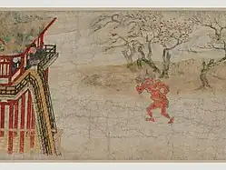 Although the scroll ends at the conclusion of this second test, the text of Gōdanshō (1104–1108), a classic of Japanese literature, allows us to know the end of the story:[8] after Kibi's success, thanks to the supernatural intervention of a spider, in the final test of providing a commentary on a poem, the Chinese decide to lock him up until he dies. Kibi, with the help of the demon, then makes the Chinese sun and moon disappear, forcing the terrified Imperial court to give him back his freedom. It is likely that a second scroll narrating the end of the legend originally existed, or was part of later versions.[9]