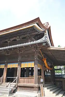 Together with the outsize honden, the most visible feature of the shrine are the twin gables on both sides of the roof. This style of roof, called hiyoku irimoya-zukuri, or "paired wing, hip-and-gable roof style", consists of two ridges at a right angle to the main roof which end in two dormer gables.[1]