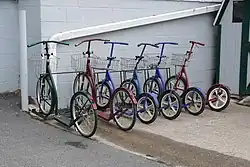 A kickbike (bikeboard, footbike, pedicycle) is a type of kick scooter (also referred to as a push-scooter or scooter) and is a human-powered street vehicle with a handlebar, deck, and wheels propelled by a rider pushing off the ground.[1] The kickbike often has a large standard size bicycle front wheel and a much smaller rear wheel, which allows for a much faster ride.