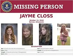 - "Jayme Closs – Located". Kidnappings/Missing Persons. Most Wanted. FBI. October 15, 2018. Archived from the original on October 24, 2018. Retrieved October 24, 2018.