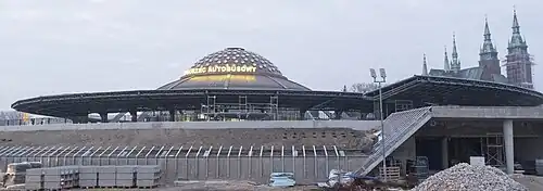 The city bought back the bus station at the end of March 2016.[9] In September 2018, a major reconstruction project was started with the goal of almost completely rebuilding the station, but preserving the basic design and the distinctive shape of the building. The works are scheduled to finish in June 2020, with a planned cost of 68,7 million PLN, 9 million of which is to be provided by the city government (with the bulk of the rest of the funding coming from the European Union).[10][11]