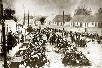 The Kielce Ghetto (Polish: getto w Kielcach, German: Ghetto von Kielce) was a Jewish World War II ghetto created in 1941 by the Schutzstaffel (SS) in the Polish city of Kielce in the south-western region of the Second Polish Republic, occupied by German forces from 4 September 1939. Before the Nazi invasion of Poland in 1939, Kielce was the capital of the Kielce Voivodeship. The Germans incorporated the city into Distrikt Radom of the semi-colonial General Government territory.[1] The liquidation of the ghetto took place in August 1942, with over 21,000 victims (men, women and children) deported to their deaths at the Treblinka extermination camp,[2] and several thousands more shot, face-to-face.[3]