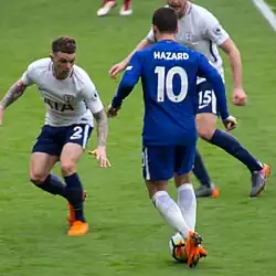 On 30 June 2017, Trippier agreed a new five-year contract with Tottenham, committing to the club until 2022.[48] As Walker had moved to Manchester City in the summer, Trippier became a regular in the starting line-up of the Spurs team early in the 2017–18 season, although he missed the opening game of the season due to an injury sustained in a pre-season friendly against Juventus that Spurs won 2–1.[49] However, a new signing for Tottenham this season, Serge Aurier, in September meant that he and Aurier regularly rotated in the right-back position.[50] He impressed with his performances in the season, in particular during the UEFA Champions League home match against Real Madrid on 1 November 2017, which Spurs won 3–1.[51]