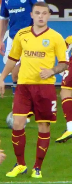 In July 2011, Trippier joined Championship club Burnley on a season-long loan as a replacement for the departing Tyrone Mears.[25] He made his debut for the Clarets in August 2011, a 2–2 home draw with Watford.[26] His first goal for the club came in September 2011, with a superb long-range free kick against Milton Keynes Dons in a 2–1 win in the League Cup.[27] His first league goal came in December 2011, a 1–0 win over Brighton & Hove Albion at the Falmer Stadium, with a powerful shot from the edge of the box.[28] In December 2011, after impressing during his loan, Trippier was nominated for the Championship Player of the Month award.[29] On 2 January 2012, he received his first professional red card for picking up two bookings in a 2–1 defeat to Leeds United.[30] A day later, Burnley signed Trippier on a permanent deal for an undisclosed fee, signing a three-and-a-half-year contract.[31] In January 2012 he scored his second goal for the club, scoring from range in a 2–0 win away to Middlesbrough.[32] In March 2012, he scored the first in a 5–1 rout against Portsmouth at Fratton Park.[33] He played in all 46 league games in his first season as the club finished in mid-table, going on to win the Burnley Player of the Year award.[34]