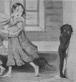 The kikimora might have the snout of a dog, a chicken beak or can even resemble a goat-like entity with glowing eyes and horns. In fact, it can take any part of an animal's face or body. It is always feminine and can appear as an old woman or a beautiful girl. She might even appear as a deceased family member.[3]
