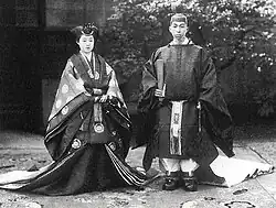 On 4 February 1930, she married Prince Takamatsu at the Tokyo Imperial Palace. The couple had no children. Shortly after the wedding, Prince and Princess Takamatsu embarked upon a world tour, partly to return the courtesies shown to them by King George V of the United Kingdom in sending a mission to Tokyo to present Emperor Shōwa with the Order of the Garter. During their journey, they travelled across the United States so as to strengthen the goodwill and understanding between their nations. The 1930 photo illustration comes from the illustrated biography on Prince Iesato Tokugawa titled The Art of Peace. The photo presents Princess and Prince Takamatsu during their reception by U.S. President Herbert Hoover.[3][4]