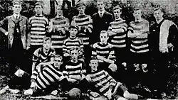 - 1887–90: black and white hooped jerseys, blue knickers[18]