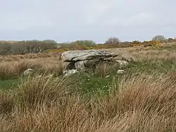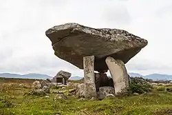 East of the R261 on rough moorland is the larger portal tomb Dg. 70 with two chambers, 9 m apart, and a modern field wall in-between. The north-eastern chamber has a roof stone with a length of 4.2 m which rests on two portal stones, both of 1.8 m height, and a very small pad-stone which in turn rests on the backstone of 1.3 m height. The smaller, south-western chamber has portal stones of 1 m height. The roof stone with a length of 1.9 m is partly dislodged.[5][10] The sill stone between the portal stones has a rectangular piece missing, a feature that is shared with the portal tombs of Poulnabrone, Ballybrittas, and Tawnatruffaun. Most of the stones are from grey granite outcrops in close vicinity to the tomb. The backstone in red Ardara granite stands in a stark contrast to the overall grey, it originates possibly from a cliffy extrusion 200 m south of the tomb.[11]