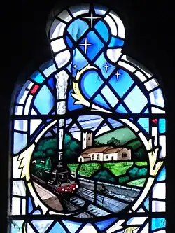 The parish church was built in 1868[14] and dedication to St Cuthbert. It replaced an earlier church of Norman origin and is approached across an iron railway bridge at the western end of Kildale station.[15] The church is in the Early English style[16] and is enhanced by its detailed stained-glass millennium window showing (amongst other panes marking Kildale's community and its beautiful surroundings) a steam train passing through Kildale, created by Goddard & Gibbs in c. 1992–96.[15] The church has a framed list of the names of all the people living in Kildale marking the millennium.[17] it includes most of the people who farmed in the parish between 1806 and 2006, the period during which Kildale has been owned by the Turton/Sutcliffe family.[17] During the construction of St Cuthbert's Church Viking relics were found[16], indicating that the church grounds have been of great importance for centuries.