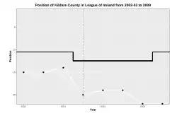 Between 2005 and 2009, Kildare County finished in the bottom half of League of Ireland First Division table every season. In 2008 Kildare County finished bottom of the table and were initially relegated to the A Championship after losing the promotion/relegation play-off to Mervue United. However they subsequently gained a reprieve after Cobh Ramblers were refused a First Division license and were relegated directly from the 2008 Premier Division to the A Championship.[15][16][19][20] In 2009 Kildare County again finished bottom of the table and they subsequently withdrew from the league.[21] The last fixture the club played was against Shelbourne on Saturday, 7 November 2009. In the week before the game the entire club board and the team manager Joe Somerville resigned, leaving the club's players unpaid. The players were owed a total of €21,650 and as a result were reluctant to take to the pitch. However Stephen McGuinness, the general secretary of the PFAI, persuaded the players to participate in the game. Meanwhile, fans had to run the ticket sales and canteen. County lost 5–1 and after fulfilling this last game, it was officially over. County were due to play Salthill Devon in a promotion/relegation play-off but as a result of their resignation this did not happen and Salthill Devon subsequently replaced Kildare County in the 2010 First Division.[22][5]