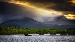 From the Meeting of the Waters a narrow channel called the Long Range leads to the Upper Lake, the smallest of the three lakes. This lake is located in rugged mountain scenery in the upper Killarney/Black Valley area. The fast run-off in its catchment area can cause the level of the lake to rise by up to a meter in a few hours during heavy rain.[20]