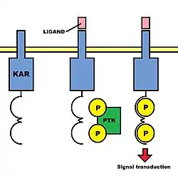 As the chains from KARs are not able to mediate any signal transduction in isolation, a common feature of such receptors is the presence of noncovalently linked subunits that contain immunoreceptor tyrosine-based activation motifs (ITAMs) in their cytoplasmic tails. ITAMs are composed of a conserved sequence of amino acids, including two Tyr-x-x-Leu/Ile elements (where x is any amino acid) separated by six to eight amino acid residues. When the binding of an activation ligand to an activation receptor complex occurs, the tyrosine residues in the ITAMs in the associated chain are phosphorylated by kinases, and a signal that promotes natural cytotoxicity is conveyed to the interior of the NK cell. Therefore, ITAMs are involved in the facilitation of signal transduction. These subunits are moreover composed of an accessory signaling molecule such as CD3ζ, the γc chain, or one of two adaptor proteins called DAP10 and DAP12. All of these molecules possess negatively charged transmembrane domains.[7]