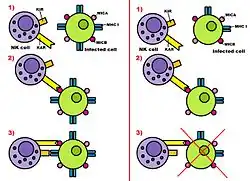 These ligands activate the NK cell, however, before the activation, Killer Inhibition Receptors (KIRs) recognize certain molecules in the MHC class I of the hosted cell and get engaged with them. These molecules are typical of healthy cells but some of these molecules are repressed in infected or transformed cells. For this reason when the hosted cell is really infected the proportion of KARs engaged with ligands is bigger than the proportion of KIRs engaged with MHC I molecules. When this happens the NK is activated and the hosted cell is destroyed. On the other hand, if there are more KIRs engaged with MHC class I molecules than KARs engaged with ligands, the NK isn't activated and the suspicious hosted cell remains alive.[4]