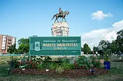 During the 2020 anti-racist police brutality protests, protesters in Richmond unofficially renamed the grassy area around Richmond's Robert E. Lee statue "Marcus-David Peters Circle". It became a regular site of protest and community gathering, with protest graffiti and messages projected in lights on the Lee statue; images of the protest art were featured on the cover of National Geographic.[7] The area marked with a sign reading "Welcome to Beautiful Marcus-David Peters Circle, Liberated by the People MMXX".[8] The eight-foot-long sign was cut down in an apparent act of vandalism in August,[9] but was soon replaced[10] and gatherings continued, including a celebration of Peters's birthday in October that drew hundreds.[11] Organizers handed out plants and STEM technology kits to children in attendance in honor of Peter's work and as a symbol of commitment to the growth of the community.[11]