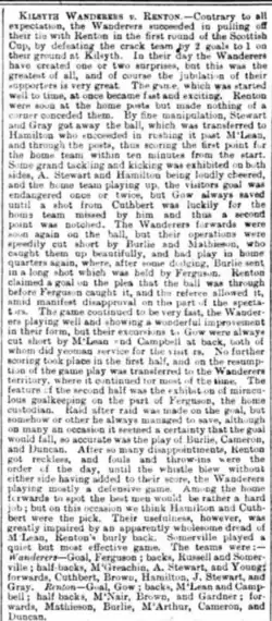 The club reached the third round, coming from 3–0 down with half-an-hour remaining to beat Clydebank Athletic 5–3 in the second, thanks to inspirational play by captain Cuthbert,[10] before the Vale of Leven pulled off the sort of result people expected Renton to inflict, beating the Wanderers 8–0 at Garrel Garden; all eight goals came in the second half.[11]