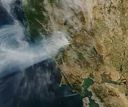 ![]() Satellite image of smoke from the Kincade Fire on October 24 | |