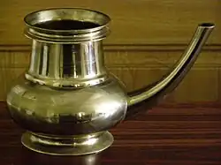Usually made of bell metal, it is commonly used during puja to dispense holy water. Kindi is also used to keep water at the entrance of the house, so that visitors can wash their feet with this water, and also to wash hands after meals.