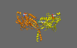 ![]() Crystallographic structure of the human kinesin motor domain depicted as a rainbow colored cartoon (N-terminus = blue, C-terminus = red) complexed with ADP (stick diagram, carbon = white, oxygen = red, nitrogen = blue, phosphorus = orange) and a magnesium ion (grey sphere).[14] | |||||||||