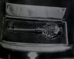 Councillor Farley gave a speech glorifying the Pavilion, the town, and Mr Dence the donor. He said, to applause, that he "hoped all would do their duty in maintaining and preserving it for the purpose for which it had been granted to the town". Mr Ingleton the builder presented a silver-gilt key to Mr Dence. On the front it bore an enamelled plate showing the heron,[32] the clock tower and Reculver. The reverse of the key bore the inscription: "Presented to T. Dence Esq., donor of the East Cliff Pavilion, Herne Bay, by A.S. Ingleton, April 4, 1904."[12] Palmer the architect explained the building's construction (detailed above), then Thomas Dence the donor gave a long and much applauded speech (also detailed above). An unnamed person unveiled the plaque commemorating Dence's gift, and the clerk to the council read and presented an address of thanks, engrossed and illuminated on vellum, to Dence. Various councillors followed that with speeches of mutual thanks and compliments, and the band on the roof ended the ceremony with God Save the King. Refreshments were provided in the gentlemen's reading room for the invited 300, who then joined the crowd on the roof to hear a concert by the Royal Engineers Band.[1]