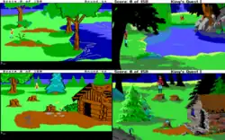 King's Quest is the first adventure game to integrate graphical animation into the player's view of the game world.[2] This shifts the focus away from the static scenery, to the player's character, which is animated on-screen. Animation sequences are in most player interactions reachable through the normal course of exploration. For example, animation sequences show Graham picking up objects from the ground, opening doors, and wading through water. Depth perspective is simulated; Graham can walk behind objects, causing his character to be hidden from view, or walk in front of them, obscuring the object. This attention to graphical animation, commonplace in action games, earned King's Quest the distinction as the first "3D-animated" adventure game.