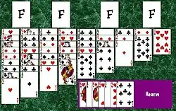Building on the tableau is down by alternating colors and only one card can be moved at a time. Only the top card of each column and all cards in the reserve are available for play as well as the top cards in the foundation. Furthermore, an empty column can be filled with any available card.