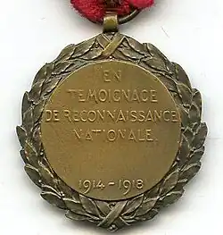 The King Albert Medal is a 35mm in diameter circular bronze medal. Its obverse bears a 25mm in diameter central medallion bearing the left profile of King Albert I with the inscription in French or in Dutch "ALBERT KING OF THE BELGIANS" (French: "ALBERT ROI DES BELGES", Dutch: "ALBERT KONING DER BELGEN") surrounded by a 5mm wide laurel wreath along the entire medal circumference. On the reverse of the central medallion, the relief inscription on four lines in French or in Dutch "IN TESTIMONY OF NATIONAL RECOGNITION" (French: "EN TEMOIGNAGE DE RECONNAISSANCE NATIONALE", Dutch: "ALS BLIJK VAN'S LANDS ERKENTELIJKHEID") with the years "1914-1918" at the bottom.[1]