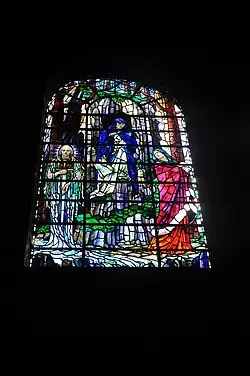 The 72 stained-glass windows illustrating the Arthurian tales are by Veronica Whall. These tell the story of King Arthur and show the coats of arms and weapons of the knights involved.[9] Whall designed 73 windows for the hall. As of 1997 it is considered to be the largest collection of stained glass panels of King Arthur made in the 20th century and a great example of Arts and Crafts workmanship.[10][11][nb 1] There are also several paintings of scenes from King Arthur's life by William Hatherell.[10]