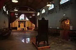 Glasscock founded the Order of the Fellowship of the Knights of the Round Table in 1927 to promote Christian ideals and his interpretation of Arthurian notions of medieval chivalry.[3] Glasscock was resident at Tintagel (in the house "Eirenikon" which he had built) and responsible for the building of King Arthur's Hall. The Hall was itself an extension of Trevena House, which had been John Douglas Cook's residence and had been built on the site of the former Town Hall and Market Hall in Fore Street.[4] 53 different types of Cornish stone are used in the construction. The hall is also used by the Order of the Fellowship of the Knights of the Round Table of King Arthur for their annual dinner, held on the first Saturday in June.[5]