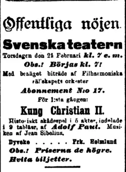 - ^ "Incidental music / King Christian II (incidental music and orchestral suite)". Jean Sibelius. Finnish Club of Helsinki. Archived from the original on 8 March 2015. Retrieved 24 September 2014.