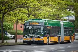 Metro's trolleybus fleet consists of 174 entirely low-floor New Flyer Xcelsior coaches.[20] Of the total, 110 are 40-foot (12 m) vehicles (model XT40) and 64 are 60-foot (18 m), articulated buses (model XT60).[20] The buses include an auxiliary power unit, to allow them to operate off-wire for up to 3 miles (4.8 km).