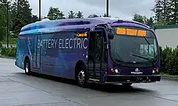 Metro began testing three new Proterra Catalyst battery electric buses in 2015.[27] The coaches are capable of traveling over 26 miles[28] before the battery needs to be recharged. A special fast charge station located at the Eastgate Park and Ride allow the bus to be fully recharged in under 10 minutes, during the driver's normally scheduled layover.[29] These new vehicles get the equivalent of 20.8 MPG, which is over 6 times better than the 3.18 MPG seen on Metro's series hybrid electric coaches.[30][31] The coaches were purchased with support from a $4.7 million Federal Transit Administration grant and entered revenue service on February 17, 2016.[32] They operate on shorter routes (due to their limited range) on the eastside, specifically Routes 226 and 241.[30][33] Metro has committed to purchasing 120 electric buses with the option to purchase up to 80 additional vehicles by 2020. In 2017 and 2018, Metro tested electric buses with ranges of 140 miles from several manufacturers,[34] and plans to have a zero-emissions bus fleet by 2040.