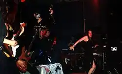 After recording and touring with Mercyful Fate, King Diamond reformed his eponymous band in 1994.[32] With the line-up of King Diamond, Andy La Rocque, as well as guitarist Herb Simonsen, bassist Chris Estes and drummer Darrin Anthony from the Texas band Mindstorm, the band spent September through October 1994, recording their next album.[3][32] Released on 6 June 1995, The Spider's Lullabye was the band's first album on Metal Blade Records, as well as their first studio release since Fatal Portrait to not be a concept album.[32] The album went on to peak at number 31 on the Finnish album charts.[33] In March 1996, King Diamond began recording their seventh studio album at the Dallas Sound Lab.[34] Released on 1 October 1996, The Graveyard saw King Diamond returning to writing concept albums.[34] The album also charted at number 23 in Finland.[35] After the album's release, drummer Darrin Anthony was forced to leave the band due to a car accident and was subsequently replaced by former Chastain drummer John Luke Hebert.[3]