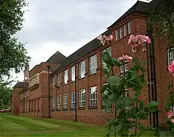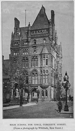 KEHS was founded in 1883 with Edith Creak, who was one of the first women admitted to a degree in London University, as the founding head.[1] The school occupied part of the 1838 New Street boys' school (Charles Barry, architect). In 1887, when the adjacent Hen & Chickens Hotel was known to be closing the governors considered acquiring it. In 1888, KEHS moved to the recently vacated, and almost brand new (1885), Liberal Club in Congreve Street (a site now covered by the lending section of the Birmingham Central Library) under a short lease. Meanwhile, plans for a new school on the Hen and Chickens site were being drawn up by the foundation's architect, J. A. Chatwin. In 1892, land behind the hotel was bought with the intention of building the girls' school off the main road. The New Street school opened in 1896. It moved, along with the boys' school, to its present location opposite the University in 1940 to new buildings designed by Holland W. Hobbiss. At this time a new, green uniform was introduced. The New Street site was bought by the Prudential Assurance Company and leased for the Odeon cinema.