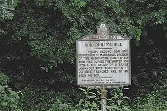King Philip's Hill is a historic site off Old Bernardston Road in Northfield, Massachusetts. In 1675 the Wampanoag chief Metacom, colloquially called "King Philip" by English colonists, is claimed to have held council here during King Philip's War. The hill has evidence of what appears to be trenches and other remnants of fortification from the time, but the exact nature of these is debatable; 19th century area historian George Sheldon believed the trenches to be the work of a colonist.[2]