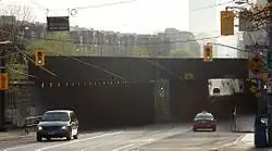 As of October 2018, King Street is served along its entire length by two overlapping Toronto Transit Commission streetcar routes: the 504A King and the 504B King, which together are the busiest streetcar routes in the fleet, with an average ridership of 65,000 passengers per day.[3] They connect with the Yonge–University subway line (Line 1) at St. Andrew station at University Avenue, and at King station at Yonge Street. They connect with the Bloor–Danforth subway line (Line 2) at Dundas West station and Broadview station. The street was also served by the 508 Lake Shore route until it was discontinued in June 2015. It was subsequently replaced by the 514 Cherry route in June 2016, which was then cancelled in October 2018 and replaced by the two 504 King branches.