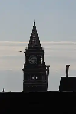 The main building's roof features Ludowici clay tile with a green glaze. The clock tower's roof is unique; it's covered with glass Ludowici tile that is backlit at night to showcase its transparency. The glass tiles were made with manganese, causing them to turn purple over time from UV exposure. During the 2013 restoration these tiles were replaced with salvaged glass tiles of the same age made by the same manufacturer.[25]