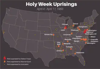 The King assassination riots, also known as the Holy Week Uprising,[2] were a wave of civil disturbance which swept across the United States following the assassination of Martin Luther King Jr. on April 4, 1968. Some of the biggest riots took place in Washington, D.C., Baltimore, Chicago, and Kansas City.