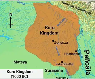 Kuru was an ancient Indian kingdom.[2] The kingdom was emerged as a branch of Rigvedic Puru tribe and lasted until Nandas of Magadha dethroned them in 350s BCE.[3] Kuru kingdom is famous for Mahabharata[4] and Kurukshetra War.[5] Its capital was Hastinapura and Indraprastha.[6]