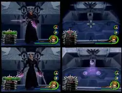 Combat in Kingdom Hearts II takes place in real-time and involves hack and slash elements with button presses which initiate attacks by the on-screen character. A role-playing game menu on the screen's bottom left, similar to those found in Final Fantasy games, provides other combat options, such as using magic or items, summoning beings to assist in battle, or executing combination attacks with other party members.[13] A new feature is the "Reaction Command", special enemy-specific attacks that are triggered when the player presses the triangle button at the correct time during battle.[14] Reaction Commands can be used to defeat regular enemies or avoid damage, and are sometimes necessary to complete a boss battle.[12] In addition to the main character, two party members are usually present who also participate in combat.[9] Although these characters are computer-controlled, the player is allowed to customize their behavior to a certain extent through the menu screen, such as attacking the same enemy Sora targets.