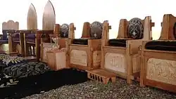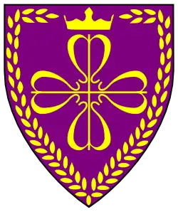 The arms of the kingdom, registered January 1984, are: Purpure, a cross of Calatrava, in chief a crown, within in bordure a laurel wreath Or.[10]