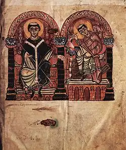 Miro, king of Gallaecia, and Saint Martin of Braga, from an 1145 manuscript of Martin's Formula Vitae Honestae,[70] now in the Austrian National Library. Martin's work was originally addressed to King Miro: "To King Miro, the most glorious and calm, the pious, distinguished for his Catholic faith"