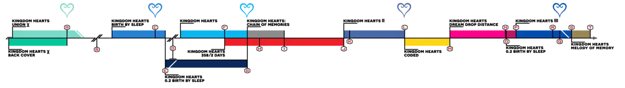 • Kingdom Hearts χ: At Tokyo Game Show 2012, Square Enix announced Kingdom Hearts χ, previously known as Kingdom Hearts for PC Browsers.[21] It is a browser game for PCs, and was only playable in Japan from July 2013 to September 2016. It features cartoon-like 2D models and is a prequel to the series, detailing the events leading up to the Keyblade War.