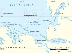 The bay is about 100 kilometres (62 mi) deep (east to west) and 65 kilometres (40 mi) wide (north to south).[1] It is bounded by the Yampi Peninsula to the south,[2] the Montgomery Reef and Koolan Island at its western extent, with Camden Sound Marine Park beyond.[3] The Kingfisher Islands, Traverse Island, Fletcher Island, and a number of other small islands lie within the bay. Fresh water flows into the bay via Secure Bay, as well as the Walcott Inlet, which brings water from the Charnley, Calder and Isdell Rivers into the bay via Yule Entrance.[4][2]