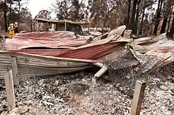 Kinglake was one of the main affected towns in the Black Saturday bushfires, with 38 people confirmed dead in Kinglake and Kinglake West, and more than 500 homes destroyed. Local resident and former GTV-9 newsreader Brian Naylor and his wife Moiree were confirmed to be amongst the dead.[6] Not long after news reports had stated that the fire went through the whole town, Deputy Police Commissioner of Victoria Kieran Walshe revealed that six of the victims had been in the same car.[7][8]