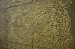Two other bodies were found in the vicinity. Traces of decorated walls, mosaic floors, underfloor heating and bath suites were discovered. Based on the dating of coins and other evidence such as a foundation burial of a young pig, it was suggested that the site had been occupied since the third century AD.[2] The layout of the building, dominated by a large hall, relatively common in Britain and Germany, led to the hypotheses by archaeologist J. T. Smith that this type of building was used by an extended family group rather than a nuclear family.[3]