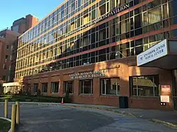 The first mention of a fourth building was on October 8, 1944. The hospital was planning its annual fundraising bazaar, which was to be held on November 21 and 22 of that year, and agreed to use the proceeds towards a $1,000,000 fund for the construction of a new building.[50] The building was initially designed to be built on land adjacent to the existing three buildings and adjoin them.[51][52][53] By December 1945, the original goal of $1,000,000 was raised to $1,500,000 due to the increase in cost of materials and labor, and a redesign was mentioned that was to add two more floors to the Anna J. Freeman Pavilion.[51] Groundbreaking ceremonies were held on June 16, 1946, and Mayor William O'Dwyer did the honors by operating a steam shovel to begin work on the building that was then mentioned to have six stories.[53][54] During the ceremonies, Isaac Albert, president of the institution at the time, stated, "Regardless of the cost of materials, we have been promised all proprieties and the help of all the contractors."[53] In October 1948, the institution's finance committee reevaluated the building's completion at a cost of $2,500,000.[55] By the fall of 1949, the building was ready for occupancy[56] and its final design was six stories, which included research laboratories, clinics, lecture halls, a hydrotherapy suit, two wings devoted to the care of children suffering from poliomyelitis and rheumatic heart conditions, and a total of 350 beds.[53] The building did not include a connection to the Anna J. Freeman Pavilion that was originally planned.